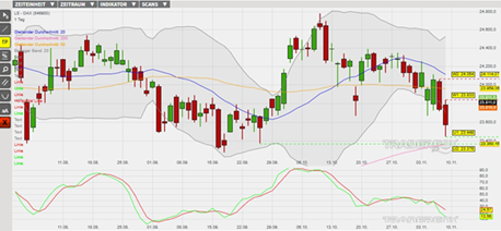 Seit rund einem Monat befindet sich der DAX in einem untergeordneten Abwärtstrend. Ausgehend vom Allzeithoch am 09. Oktober hat sich dabei eine Struktur mit sinkenden Verlaufshochs und -tiefs im Chart etabliert. Außerdem hat sich die Verkaufsdynamik an den letzten Tagen beschleunigt, wodurch sich die Bollinger-Bänder ausweiten. Hierbei wirken die Verkaufssignale des GD 20, GD 50 und eines in der Slow Stochastik als Belastungsfaktoren. Der Index könnte in Richtung des GD 200 tendieren, welcher eine mittelfristig relevante Supportzone darstellen könnte.