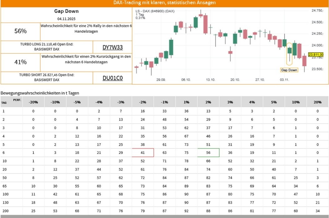 Die Erfolgswahrscheinlichkeiten für das Signal "Gap Down" beruhen auf einer historischen Auswertung des Signals auf den LS-DAX im Zeitraum vom 02.01.2000 bis zum 07.11.2025. Dabei wurden die folgenden Voreinstellungen und Filter vorgenommen: