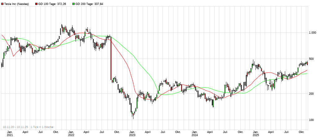 Die Experten sind gespalten. Der Konsens liegt bei Halten, das durchschnittliche Kursziel unter dem aktuellen Niveau. Einige Analysten bleiben optimistisch und sehen Kursziele von bis zu 600 US-Dollar. Sie verweisen auf Chancen in den Bereichen Künstliche Intelligenz, Energiespeicherung und der Monetarisierung von Teslas autonomer Fahrsoftware (FSD). Andere zeigen sich hingegen zurückhaltender und stellen die hohe Bewertung der Aktie infrage. Insbesondere angesichts des noch ausstehenden Nachweises operativer Fortschritte bei Autonomie und KI.