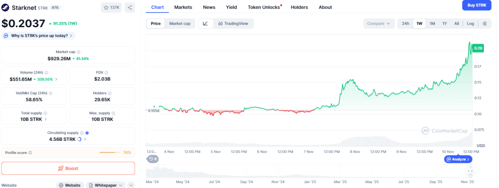 Starknet ($STRK) hat in den letzten Tagen eine beeindruckende Rallye hingelegt. Der Token stieg innerhalb von 24 Stunden um rund 41 Prozent und liegt damit weit über der Performance von Bitcoin mit plus 4 Prozent und Ethereum mit plus 7 Prozent. Der starke Anstieg wird laut Coinmarketcap durch drei Hauptfaktoren angetrieben: das BTCFi Incentive Programm, den technischen Ausbruch und die allgemeine Erholung am Kryptomarkt.