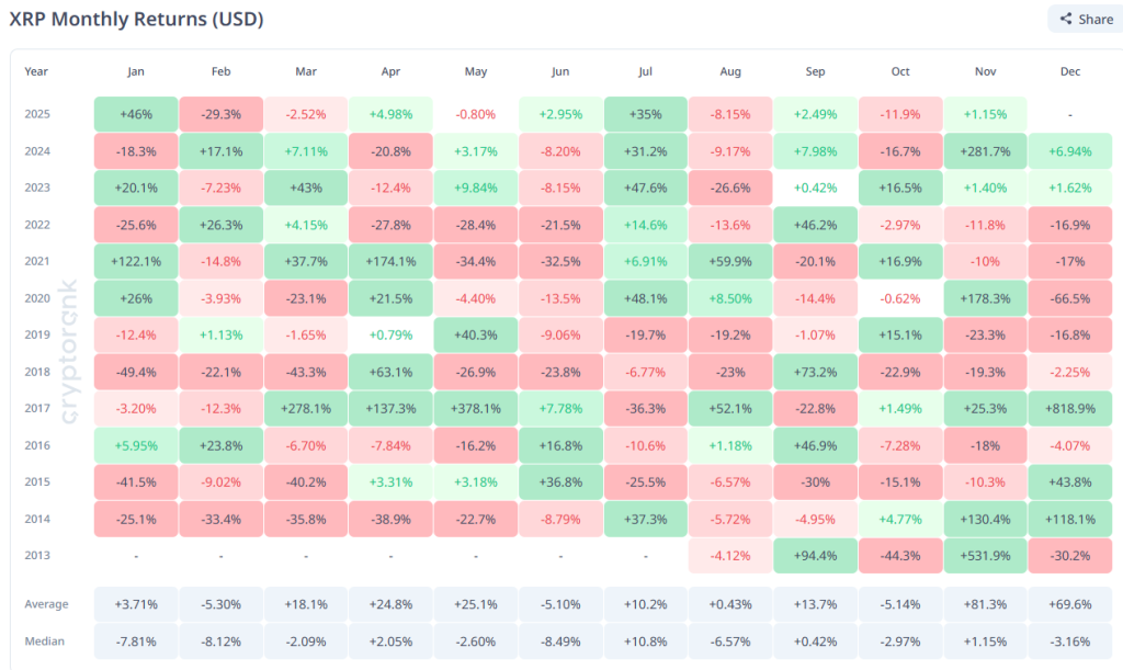 Trotz der jüngsten Verkaufswelle bleibt die Statistik auf der Seite der Bullen. Historisch betrachtet ist der November der stärkste Monat für XRP mit einem durchschnittlichen Gewinn von rund 81 %.