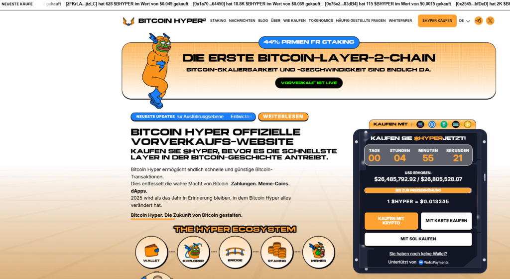 Mit einer aktuellen Staking-Rendite von 44 % pro Jahr und einem Presale-Volumen von über 26,4 Millionen US-Dollar zählt Bitcoin Hyper zu den aussichtsreichsten Layer-2-Projekten des Jahres 2025.