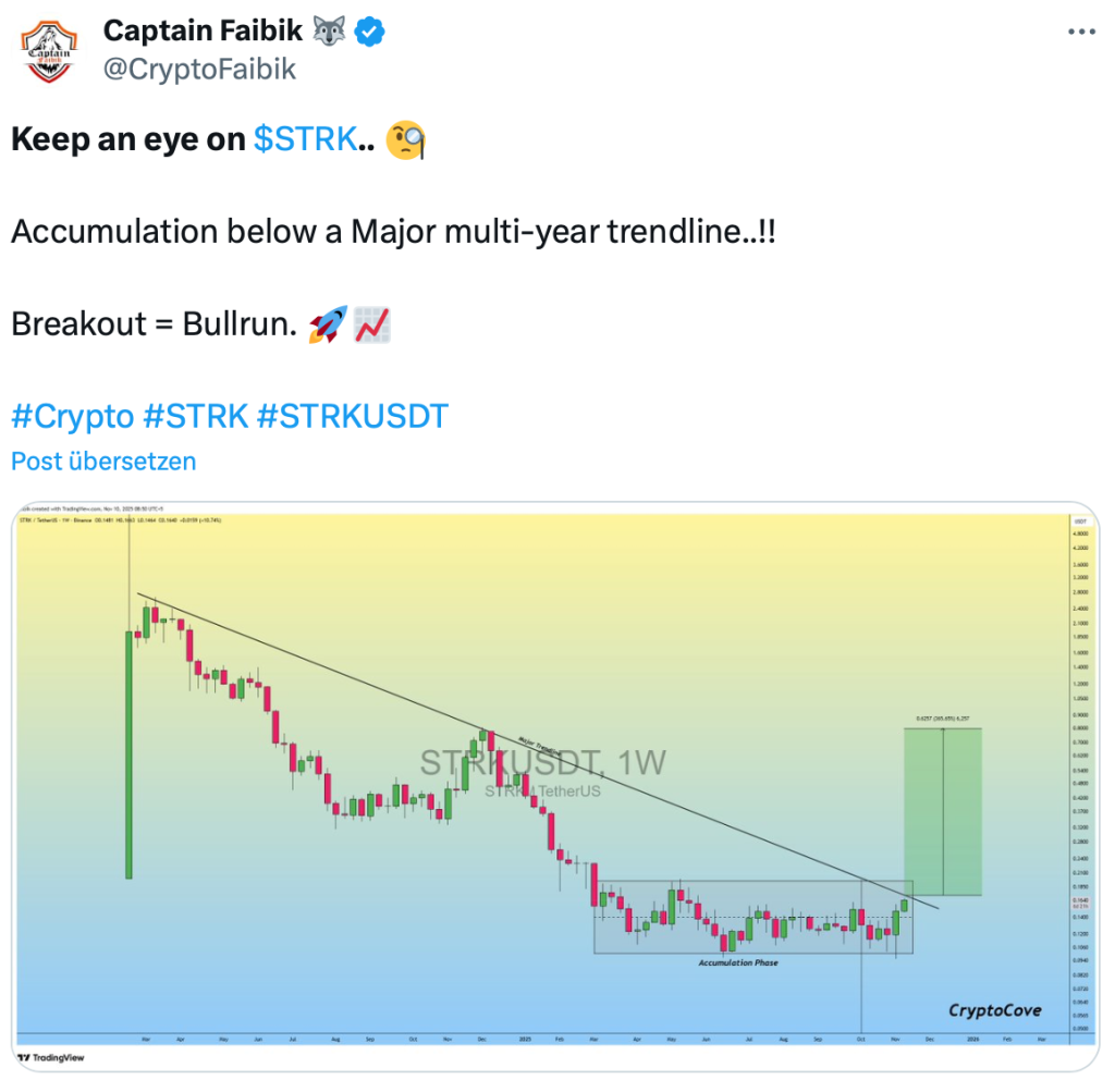 Der bekannte Analyst Captain Faibik sieht bei STRK nun das größte Kurspotenzial seit Monaten. Laut seiner Analyse habe der Coin eine neunmonatige Akkumulationsphase abgeschlossen und stehe kurz davor, eine Major-Trendlinienach oben zu durchbrechen.