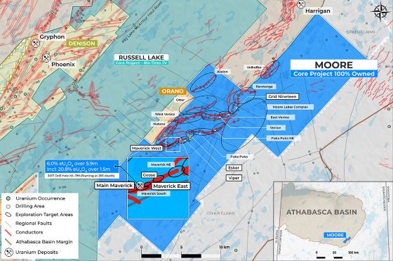 Das Moore-Projekt beherbergt eine bedeutende hochgradige Uranmineralisierung in der Main Maverick Zone, die ursprünglich in den frühen 2000er Jahren von JNR Resources entdeckt wurde. Zu den historischen Bohrergebnissen zählen 4,03% U3O8 auf 10 Metern, einschließlich 20% U3O8 auf 1,4 Metern in einer Tiefe von 265 Metern (Bohrloch ML-61).