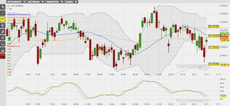 Am 07. November hat der DAX eine lange, rote Tageskerze mit einem Schlusskurs im überverkauften Bereich unterhalb des Bollinger-Bandes absolviert. Zugleich notieren die Signallinien der Slow Stochastik mit Werten von unter 30 Punkten im überverkauften Bereich. Am 10. November konnte der DAX dann eine Erholungsbewegung zum Abbau der überverkauften Situation einleiten. Hierbei ist der Index mit einem Kurssprung in den Tag gestartet. Die entstandene Kurslücke ist bis zum Handelsende offengeblieben und der Index konnte zum GD 50 steigen. Sollte der nachhaltige Kursanstieg über den GD 50 gelingen, dann würde ein Kaufsignal getriggert werden. Dieser Etappenschritt könnte zugleich die Signallinien der Slow Stochastik ansteigen lassen. Wenn die grüne Signallinie des Oszillators wieder nachhaltig über die rote Signallinie steigt, dann weist auch die Slow Stochastik ein Kaufsignal aus. Das Kaufsignal des GD 200 ist derweil weiterhin intakt. Sollten heute Anschlusskäufe einsetzen, dann könnte das Tageshoch vom 10. November bei 24.029 Punkten (Widerstand 1) die erste Barriere darstellen. Anschließend könnte der Index die Zurückeroberung des GD 20 forcieren und zum lokalen Maximum vom 03. November bei 24.250 Punkten (Widerstand 2) tendieren. Impulse erwarten die Anleger heute durch eine Rede der EZB-Präsidentin Lagarde. Außerdem stehen die ZEW-Daten zur Einschätzung der aktuellen Lage sowie den Konjunkturerwartungen für Deutschland auf der Agenda. Vorbörslich wird der DAX mit einem Kursanstieg von +0,3 % getaxt. Das Long-Szenario ist hinfällig, wenn der DAX unter die Marke von 23.449 Punkten (Unterstützung 2) fällt.