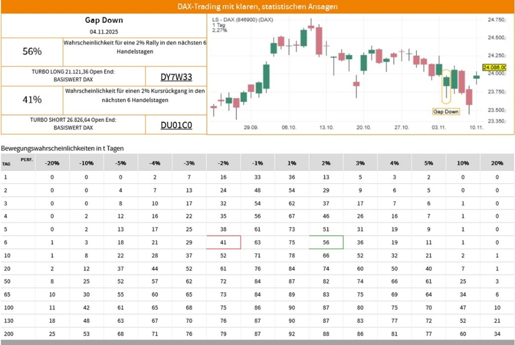 Die Erfolgswahrscheinlichkeiten für das Signal "Gap Down" beruhen auf einer historischen Auswertung des Signals auf den LS-DAX im Zeitraum vom 02.01.2000 bis zum 10.11.2025. Dabei wurden die folgenden Voreinstellungen und Filter vorgenommen: