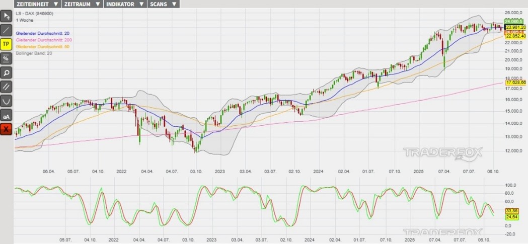 Der Chart zeigt die Entwicklung des Indikators der Slow Stochastik in der Vergangenheit. Zukünftige Ergebnisse können sowohl niedriger als auch höher ausfallen. Eine Kerze im Chart entspricht einer Börsenwoche. Quelle: https://www.dzbank-wertpapiere.de/markets/daxanalyse
