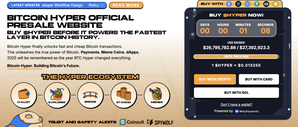 Mit über 26,5 Millionen US-Dollar im laufenden Presale zählt Bitcoin Hyper zu den erfolgreichsten Projekten des Jahres 2025. Das Ziel: Bitcoin nicht nur als digitales Gold, sondern als Basis für dezentrale Anwendungen (DeFi, NFTs und Smart Contracts) zu etablieren.