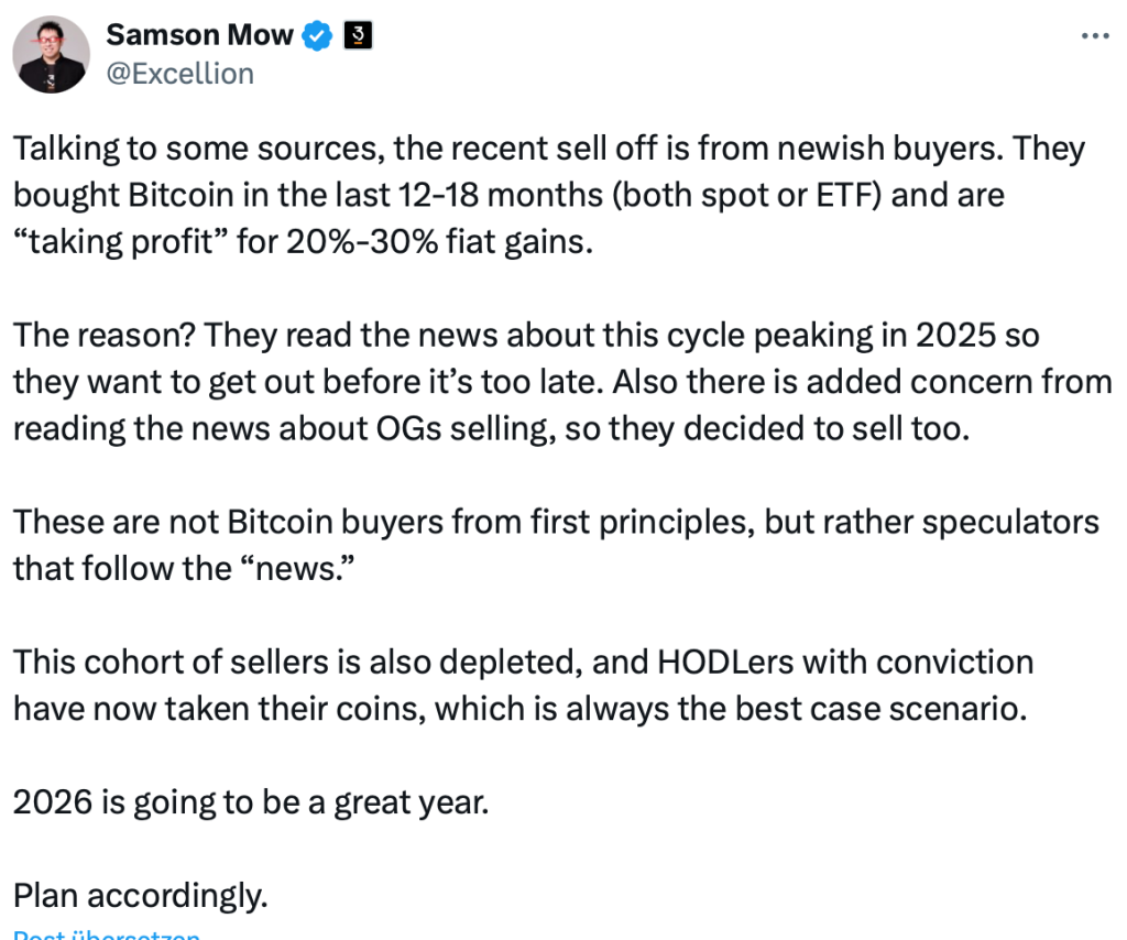 Der bekannte Bitcoin-Verfechter Samson Mow hält die jüngste Kurskorrektur für eine gesunde Marktbereinigung, nicht für den Beginn eines neuen Bärenzyklus. Seiner Analyse zufolge stammen die Verkäufe der vergangenen Wochen vor allem von kurzfristig orientierten Anlegern, die zwischen 20 und 30 % Gewinnmitnahmen realisierten.