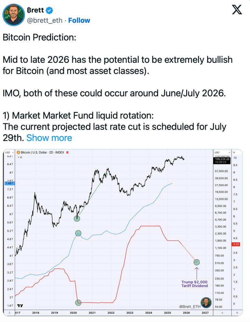 - Ende der Zinssenkungszyklen - Ab Mitte 2026 dürfte Kapital aus Geldmarktfonds wieder verstärkt in risikoreichere Anlageklassen wie Bitcoin fließen.