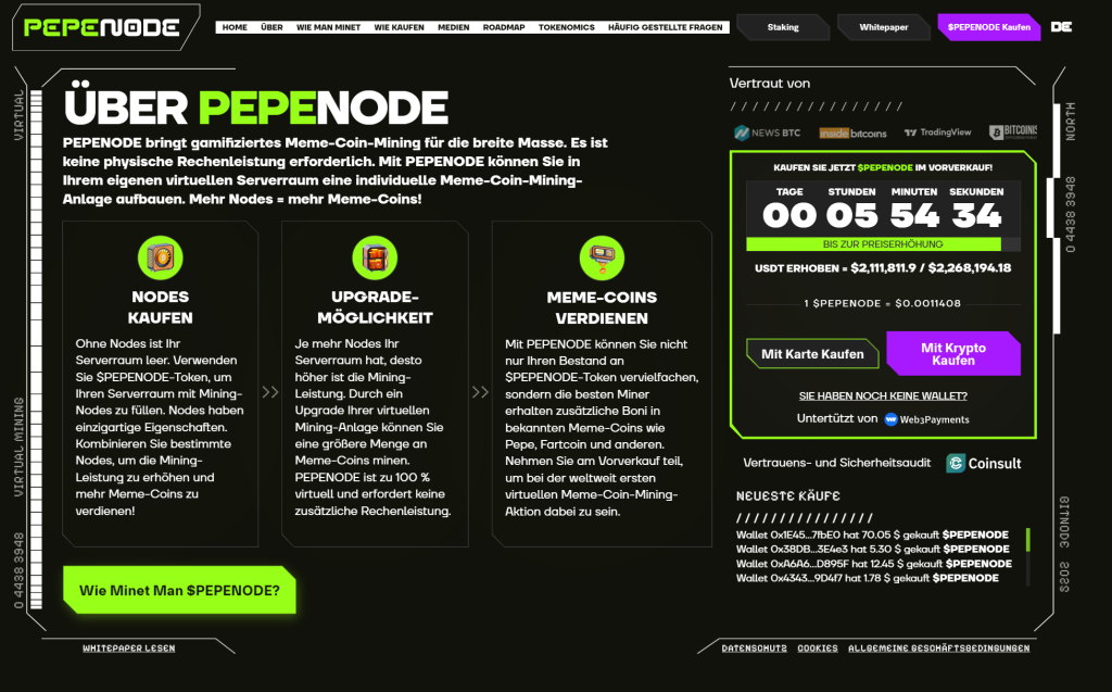 PepeNode führt ein innovatives virtuelles Mining-System ein. Anleger können mit ihren Tokens digitale Mining-Nodeserwerben, aufrüsten und dadurch zusätzliche PepeNode-Coins generieren - ganz ohne physische Hardware oder hohen Energieverbrauch.