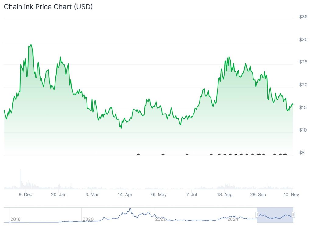 Nach dem jüngsten Krypto-Crash ist auch Chainlink stark gefallen. Seit August verlor der Coin mehr als 40 % seines Wertes und rutschte auf Tiefstände unter 15 US-Dollar ab. Damit liegt LINK weit unter seinem Jahreshoch von 27 US-Dollar und noch deutlicher unter dem Allzeithoch von 50 US-Dollar (2021).