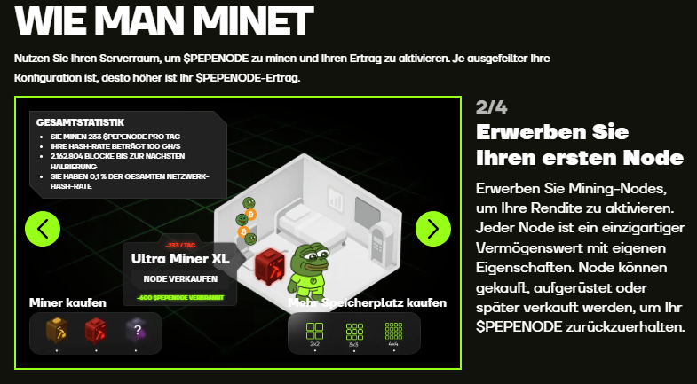 Statt reale Rechenleistung zu verbrauchen, simulieren Spieler Mining Vorgänge in einer digitalen Umgebung. Mit den PEPENODE Token lassen sich virtuelle Serverräume ausbauen und Mining Nodes kaufen. Je besser die Kombination der Nodes, desto höher die Erträge im Spiel.