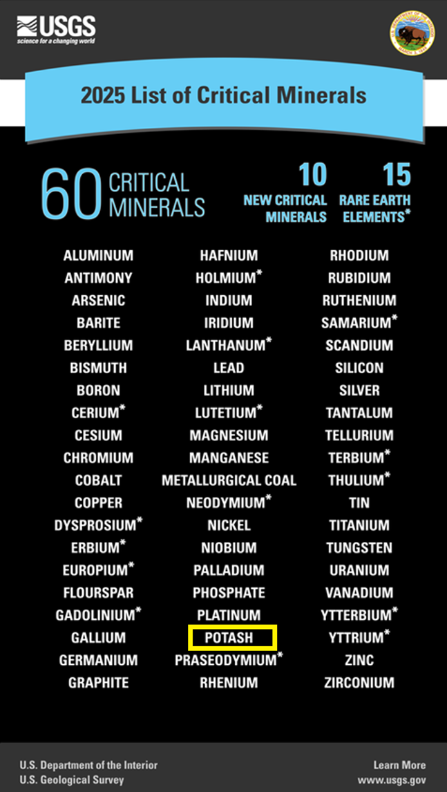 Am 7. November 2025 hat das US-Innenministerium die finale Version seiner 2025 "List of Critical Minerals' veröffentlicht. Unter den 60 aufgeführten Rohstoffen befindet sich auch "Potash'.