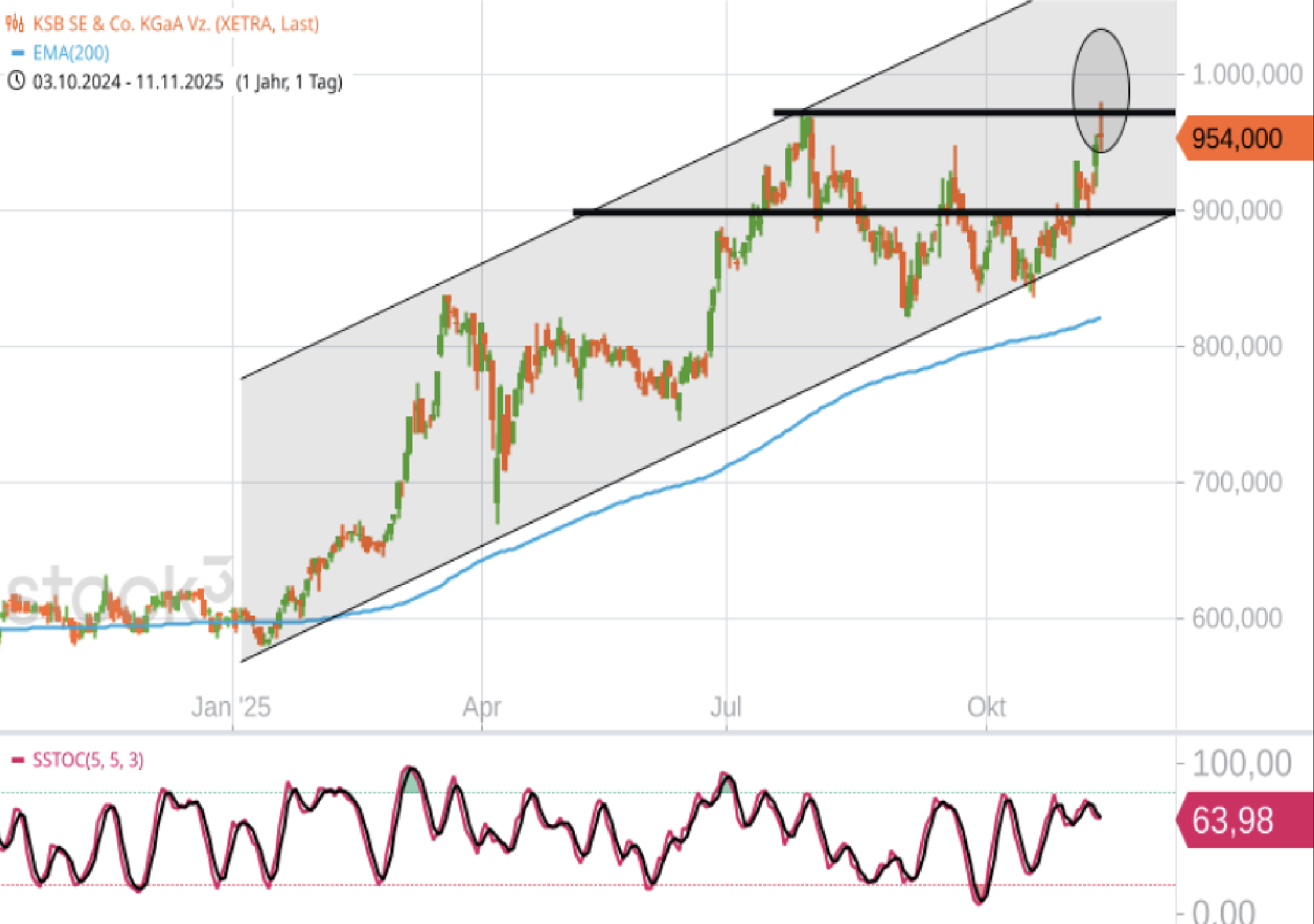 Trotz Makro-Gegenwind liefert KSB ein robustes Q3. Pumpen und das wachsende Wassersegment treiben das Geschäft, Energie stabilisiert sich und schaltete in Q3 wieder in den Wachstumsmodus. Rechnet man den SAP S/4HANA-Sondereffekt heraus nebst negativen Währungseffekten, wächst KSB im Umsatz und im Auftragseingang um rd. 5 % und beim operativen Gewinn um rd. 8,5 %. KGV 10,6 für 2026 bzw. 9,5 für 2027 erlauben weiteres Potenzial. Wasser & Abwasser, die Erneuerung großer Kraftwerksinfrastruktur, Bergbau und das Service-Geschäft bleiben die strukturellen Wachstumstreiber über die nächsten Jahre. Der CEO blickt zuversichtlich auf das Gesamtjahr 2025 und ist überzeugt, weiterhin im Zielkorridor für Auftragseingang, Umsatz und Ergebnis zu landen. Er rechnet mit einem neuen Rekordjahr auf bereinigter Basis.