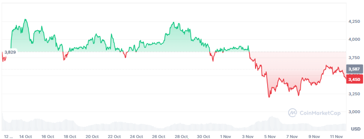 Ethereum (ETH), die zweitgrößte Kryptowährung, zeigt sich ebenfalls schwach.