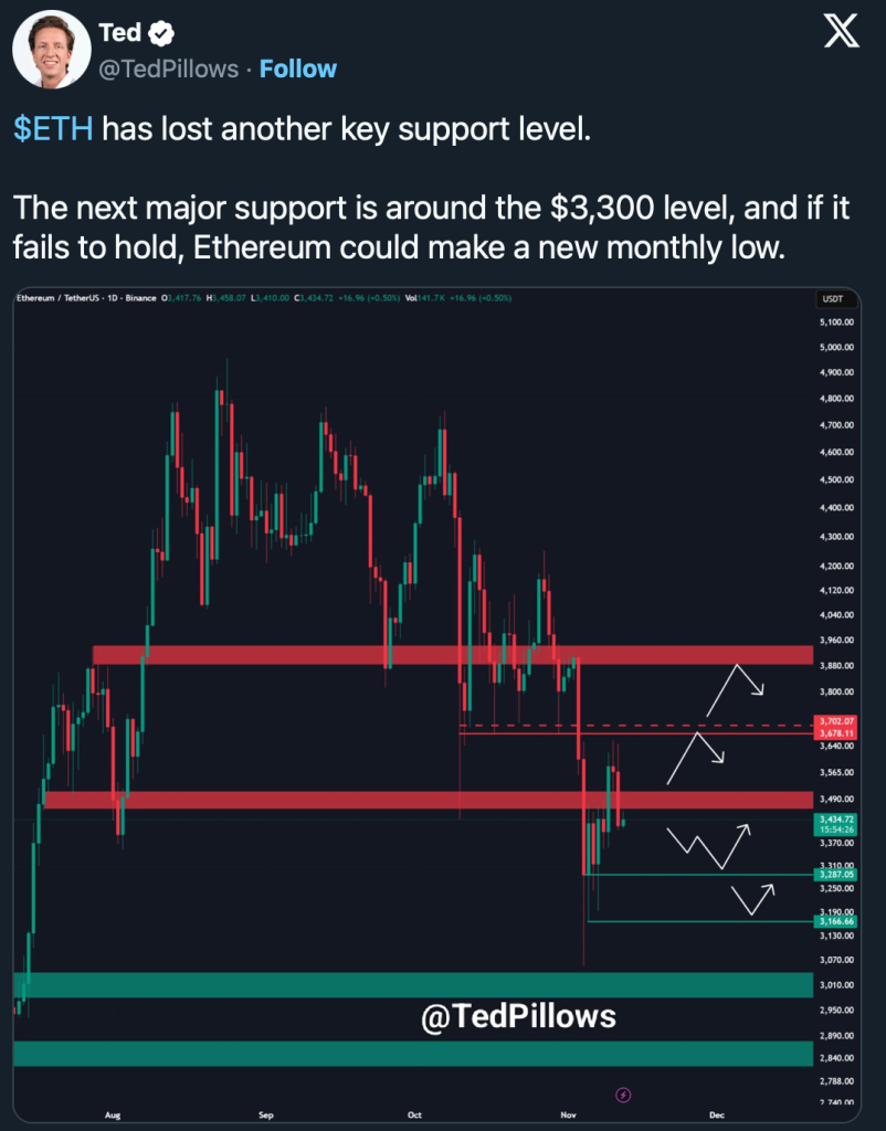 - Analyst Ted Pillows warnt:"Solange ETH unter 3.500 US-Dollar bleibt, ist das kurzfristige Risiko nach unten größer als die Chance nach oben."