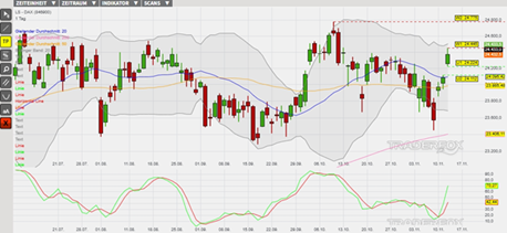 Der DAX hat nach der Kursschwäche in der letzten Woche, wo sich der Index vier Tage lang nicht nachhaltig vom unteren Bollinger-Band lösen konnte, in dieser Woche zu einer Fortsetzung des übergeordneten Aufwärtstrends angesetzt. Hierbei wurden bereits drei Gap-Ups und grüne Tageskerzen mit jeweils steigenden Hochs und Tiefs verzeichnet. Die entstandenen Kurslücken vom 10. November und 12. November sind dabei offengeblieben. Außerdem weiten sich die Bollinger-Bänder aus und die Annäherung an das Allzeithoch wird vollzogen. Bestätigt wird diese Bewegung derzeit durch die Kaufsignale des GD 20, GD 50, GD 200 und eines in der Slow Stochastik.