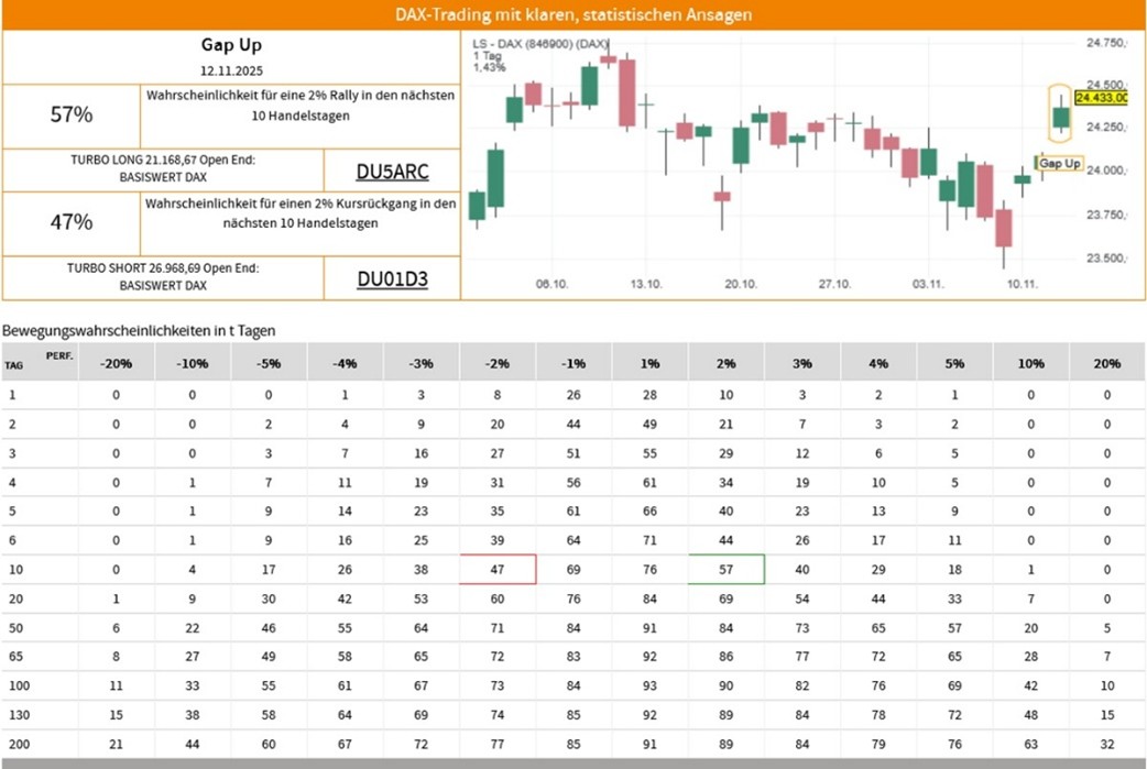 Die Erfolgswahrscheinlichkeiten für das Signal "Gap Down" beruhen auf einer historischen Auswertung des Signals auf den LS-DAX im Zeitraum vom 02.01.2000 bis zum 11.11.2025. Dabei wurden die folgenden Voreinstellungen und Filter vorgenommen:
