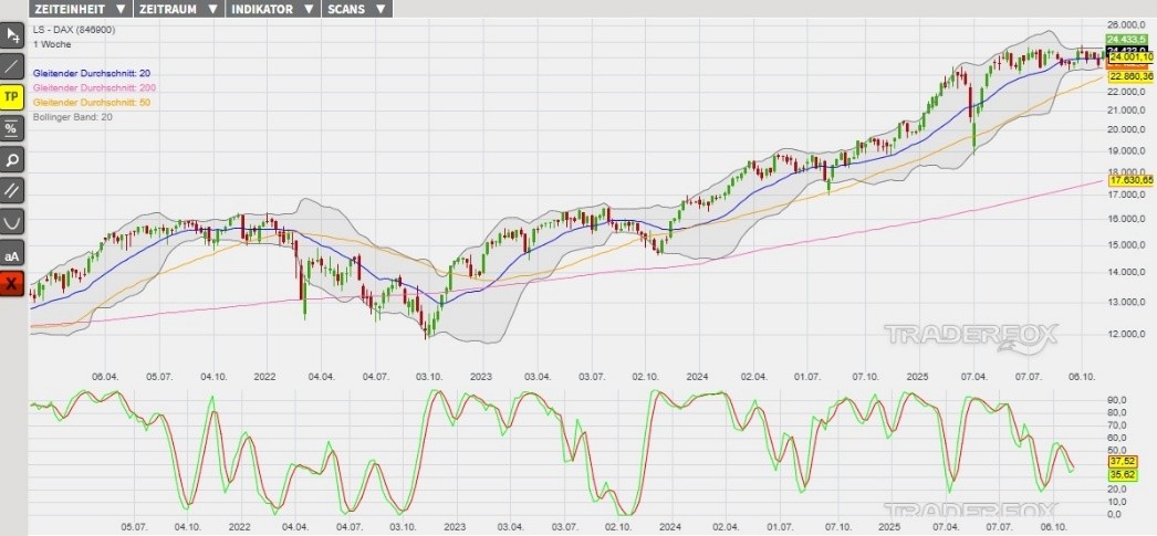 Der Chart zeigt die Entwicklung des Indikators der Slow Stochastik in der Vergangenheit. Zukünftige Ergebnisse können sowohl niedriger als auch höher ausfallen. Eine Kerze im Chart entspricht einer Börsenwoche. Quelle: https://www.dzbank-wertpapiere.de/markets/daxanalyse