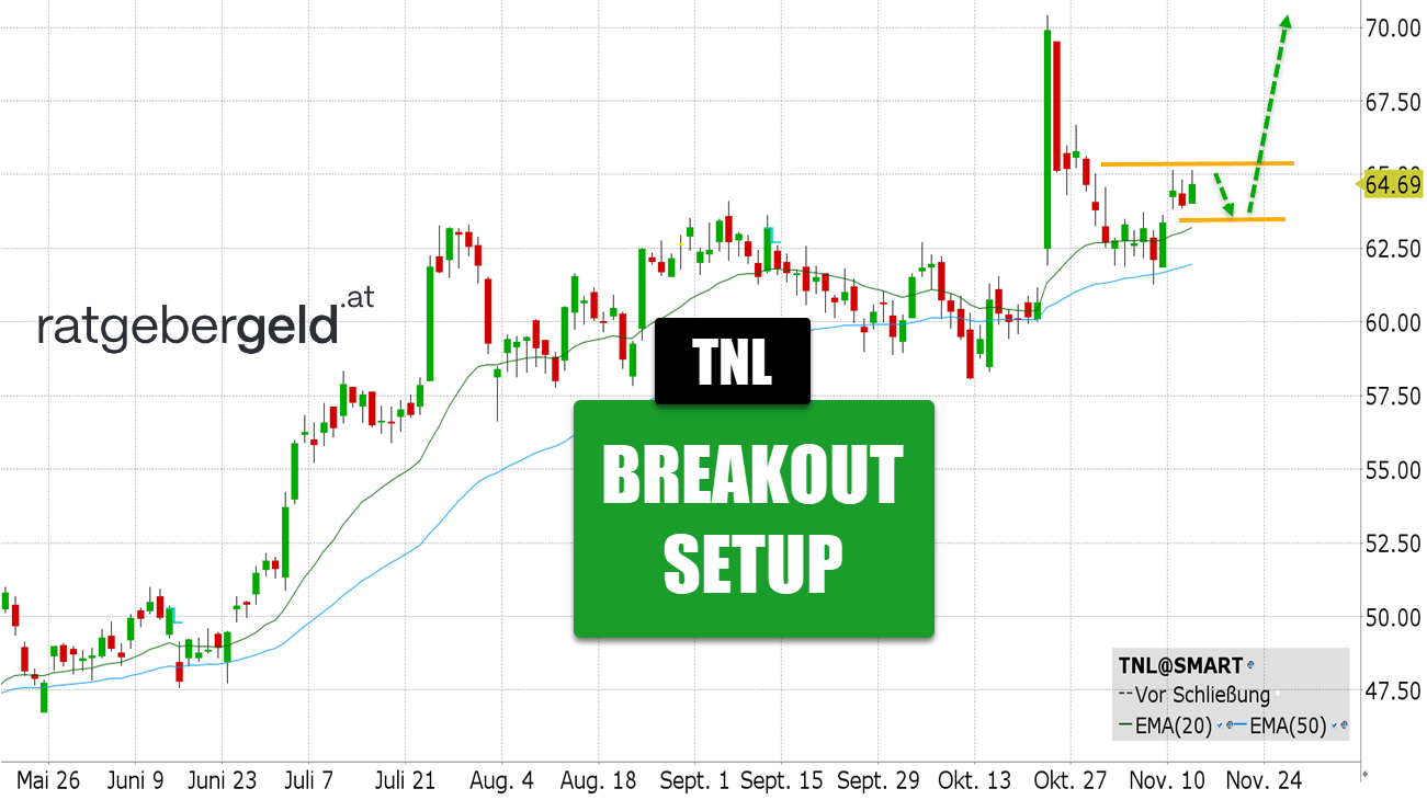 Rückblick: Wir fokussieren uns auf die Kursentwicklung nach der Meldung zum dritten Quartal bei der Travel-+-Leisure-Aktie. Das Wertpapier reagierte mit einem deutlichen Kurssprung und einer langen grünen Kerze. Der anschließender Rücksetzer testete intraday den 50er-EMA. Zuletzt gab es eine Seitwärtsrange oberhalb des 20er-EMA, die sich als Startrampe für einen Long Trade eignen könnte.