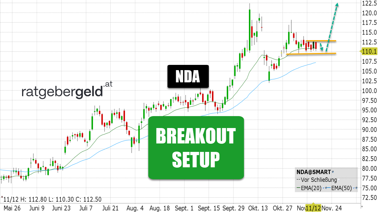Beim Ausbruch über die knapp unter 113 EUR liegende Widerstandslinie wäre in Kürze ein neues Allzeithoch möglich, was gleichzeitig eine Fortsetzung des Aufwärtstrends bedeuten würde.