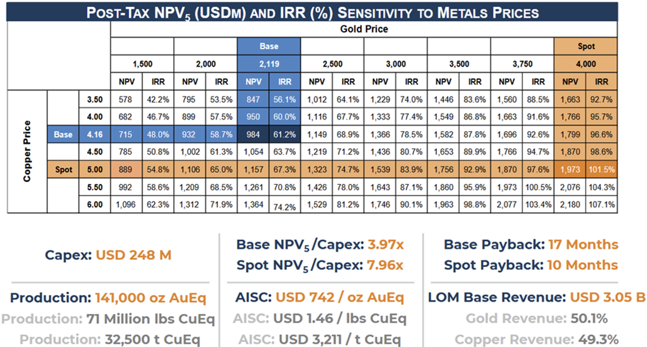 Ökonomisch zündet das Projekt die nächste Stufe: Ein "NPV' nahe 1 Mrd. USD bei niedrigen "All-in'-Kosten von nur ~742 USD/oz AuÄq bzw. ~1,46 USD/lb CuÄq, ein moderater "Initial-CAPEX' von nur rund 248 Mio. USD und eine "Payback'-Zeit von ~17 Monaten sprechen Klartext. In den ersten fünf Jahren sind ~141.000 oz AuÄq und ~71 Mio. lb CuÄq pro Jahr geplant - genau die Mischung, die Cashflow und Wachstum vereint.