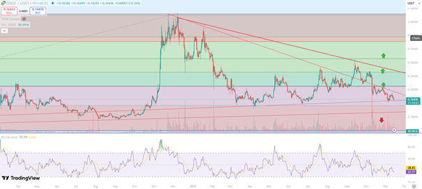 Dogecoin wurde zuletzt mit dem Rest des Krypto-Marktes nach unten gezogen, wobei Bitcoin nun schon zum dritten Mal die Marke von 100.000 USD getestet hat. Zurückzuführen ist dies vor allem auf die mittlerweile deutlich geringe Chance für eine weitere Zinssenkung im Dezember, die sich in den letzten Wochen von 96 % auf lediglich 50,7 % verringert hat.