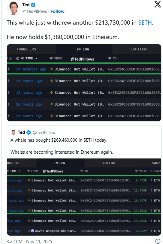 Besonders ins Auge fällt ein mysteriöser Großinvestor, der innerhalb weniger Tage Ethereum im Wert von 1,3 Milliarden US-Dollar akkumuliert hat. Auch BitMine, ein Unternehmen, das bereits Milliarden in ETH investiert hat, kaufte in der jüngsten Korrektur weiter zu. Diese institutionelle Nachfrage deutet auf längerfristiges Vertrauen in die Marktstruktur von Ethereum hin.