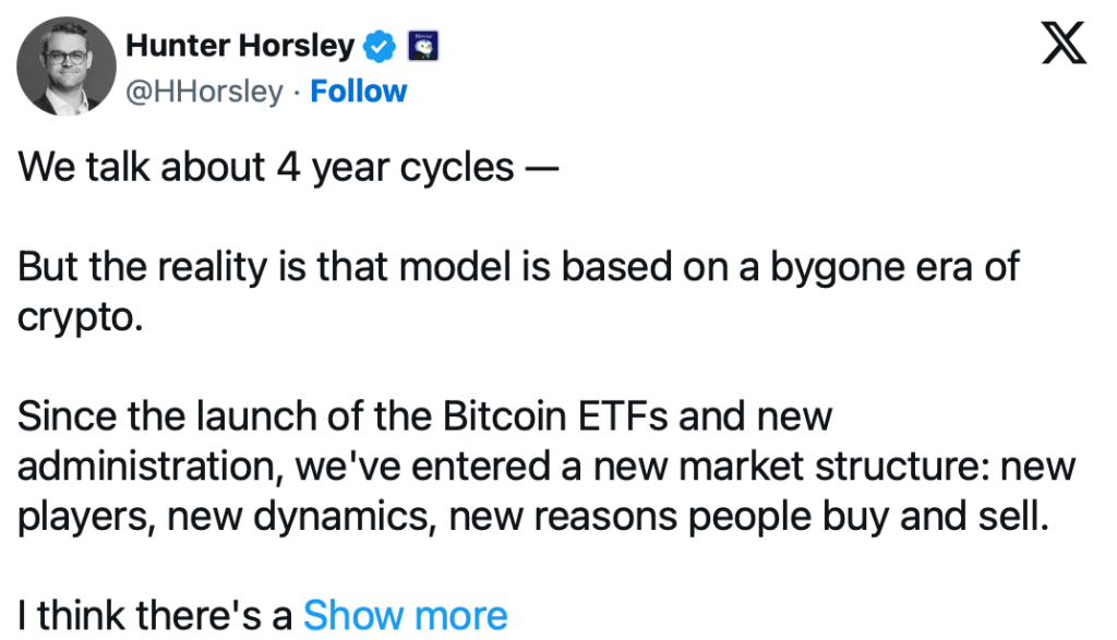 Diese Entwicklungen hätten die Marktmechanik grundlegend verändert. Neue Kapitalquellen, vor allem institutionelle Investoren, beeinflussen den Markt deutlich stärker als in früheren Zyklen. Klassische 4-Jahres-Zyklen seien daher nicht mehr anwendbar.