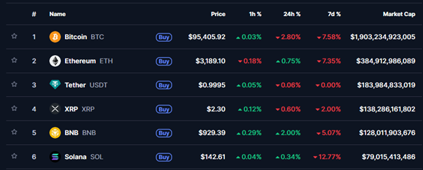 Derzeit wird BTC bei 95.405 USD gehandelt, was 2,80 % unter dem gestrigen Niveau ist. Ethereum konnte hingegen sogar einen kleinen Gewinn von 0,75 % erzielen und notiert derzeit bei 3.189 USD, während es bei Solana 0,34 % und ein Kurs von 142,61 USD sind. XRP befindet sich hingegen 0,60 % unter dem gestrigen Niveau, womit der Coin bei 2,30 USD steht.