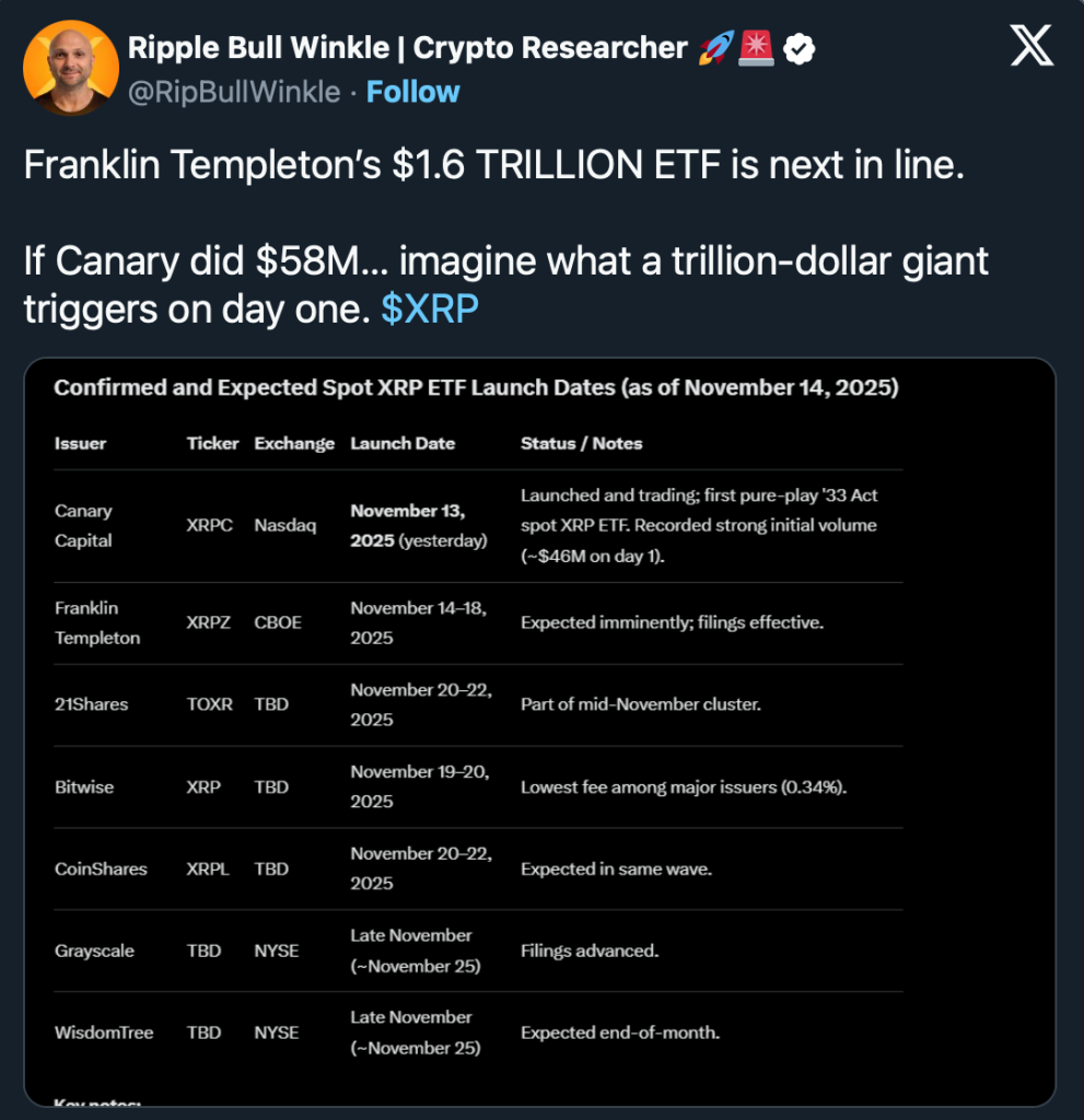 Erst vor wenigen Tagen launchte der erste XRP-Spot-ETF von CanaryCapital (Ticker: XRPC). Zudem stehen weitere große ETF-Emittenten wie Franklin Templeton, Bitwise, Grayscale und 21Shares bereits bereit.
