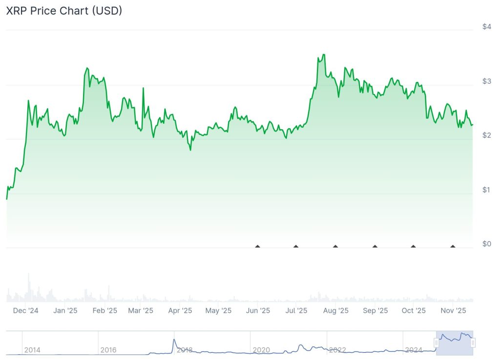 Nach einer beeindruckenden Rallye im Jahr 2025 befindet sich XRP seit dem Sommer in einem deutlichen Abwärtstrend. Von seinem Jahreshoch bei 3,65 US-Dollar ist der Coin inzwischen weit entfernt. In den letzten Wochen verlor XRP allein über sieben Prozent und fiel auf Tiefs von 2,2 US-Dollar.