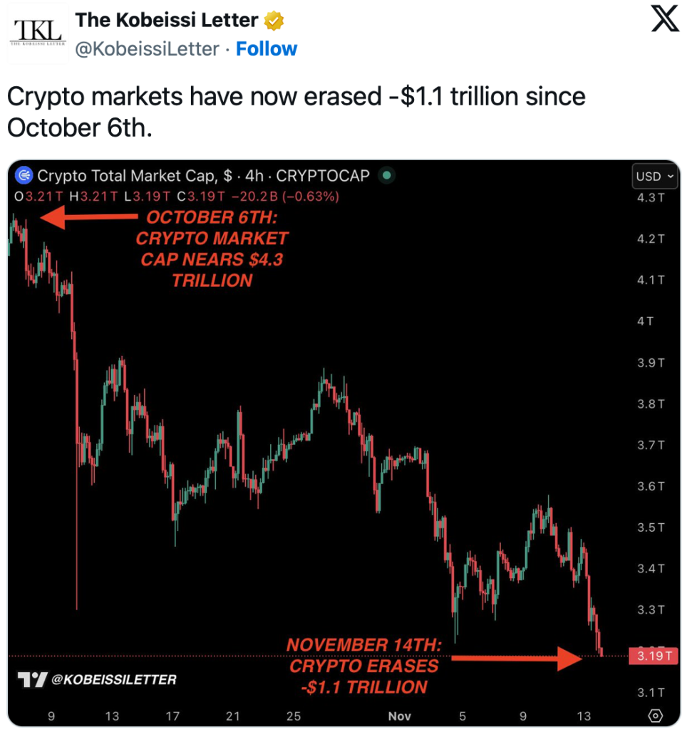 Noch im Jahr 2023 war der gesamte Kryptomarkt etwa 1 Billion US-Dollar wert. Die letzten Wochen löschten also Wert in Höhe des damaligen Gesamtmarktes aus.