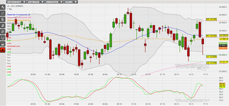 Die Schwankungsintensität hat in den letzten Handelstagen wieder zugenommen. Ausgehend vom lokalen Minimum am 07. November bei 23.449 Punkten konnte der DAX bis zum lokalen Maximum am 12. November bei 24.445 Punkten um rund 1.000 Punkte zulegen. Anschließend folgten zwei dynamische Verkaufstage, wodurch der Index temporär sogar bis in den überverkauften Bereich unter das sich ausweitende Bollinger-Band gesunken ist. Diese bearishe Tendenz wird derzeit noch durch Verkaufssignale des GD 20, GD 50 und eines in der Slow Stochastik verstärkt.