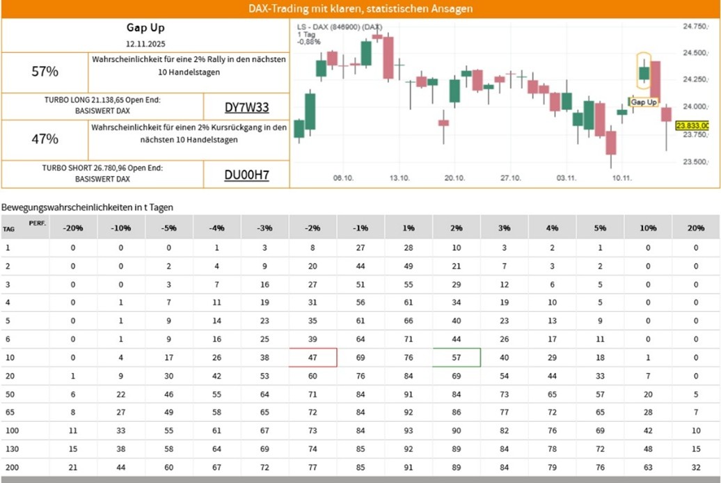 Die Erfolgswahrscheinlichkeiten für das Signal "Gap Up" beruhen auf einer historischen Auswertung des Signals auf den LS-DAX im Zeitraum vom 02.01.2000 bis zum 14.11.2025. Dabei wurden die folgenden Voreinstellungen und Filter vorgenommen:
