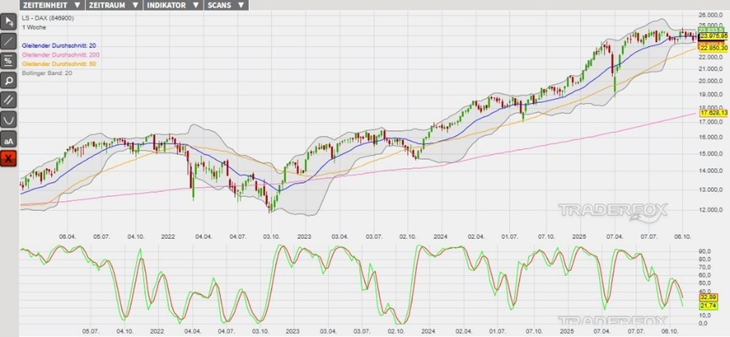 Die Schwankungsintensität im DAX hat in den letzten beiden Wochen stark zugenommen. So konnte der Index vom lokalen Minimum am 07. November bei 23.449 Punkten bis zum lokalen Maximum am 12. November bei 24.445 Punkten innerhalb von vier Tagen um rund 1.000 Punkte zulegen. Ausgehend von dem Verlaufshoch ist der Index dann allerdings bis zum lokalen Minimum am 14. November bei 23.606 Punkten innerhalb von drei Handelstagen wieder um 839 Punkte eingebrochen. Zugleich war der DAX dadurch am Freitag temporär bis unter das untere Bollinger-Band in den überverkauften Bereich gesunken. Diese überverkaufte Marktsituation hat wiederum die Basis für eine Erholungsbewegung gelegt. Sollten in dieser Woche Anschlusskäufe erzielt werden, dann könnte die Zurückeroberung des GD 50 und GD 20 zwei neue Kaufsignale erzeugen. Kursanstiege könnten außerdem dazu beitragen, dass die grüne Signallinie der Slow Stochastik wieder über die rote Signallinie steigt. Hierdurch würde auch der Oszillator ein Kaufsignal triggern. Derzeit weist nur noch der GD 200 ein Kaufsignal aus.