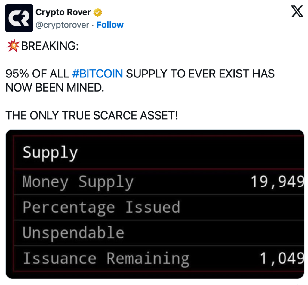 Bitcoin nähert sich einem historischen Punkt: 95 % aller jemals existierenden BTC sind bereits gemined. Damit bleiben weniger als fünf Prozent des gesamten Angebots übrig - ein Meilenstein, der die absolute Knappheit deutlich unterstreicht. Denn das Bitcoin-Protokoll ist klar: Bei 21 Millionen BTC ist Schluss. Je näher diese Grenze rückt, desto härter wird der Wettbewerb um die letzten verfügbaren Coins.
