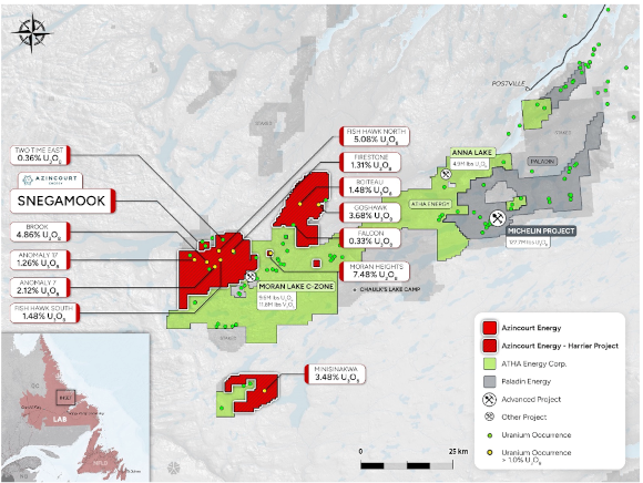In genau diesem Umfeld liegen das Harrier-Uranprojekt und die Snegamook-Lagerstätte von Azincourt Energy. Beide Projekte befinden sich in unmittelbarer Nähe einiger der bedeutendsten Uranentdeckungen des Gebiets, darunter Moran, Kitts und Jacques Lake, sowie dem Michelin-Projekt von Paladin Energy. Michelin zählt mit sechs Lagerstätten und insgesamt 127,7 Mio. Pfund U3O8 zu den größten unerschlossenen Uranressourcen der Welt. Die Hauptlagerstätte "Michelin" allein bringt es auf beeindruckende 92 Mio. Pfund (davon 82,2 Mio. Pfund gemessen und angezeigt).