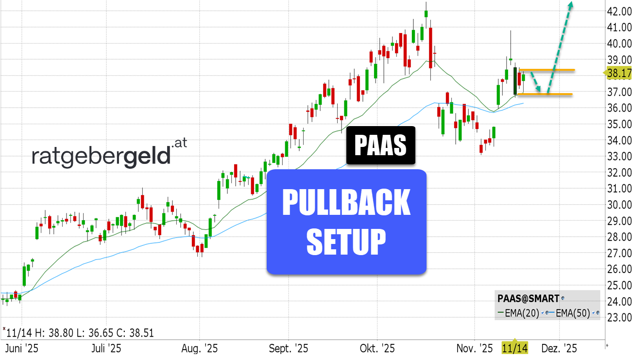 Pan American Silver verfehlte im Q3 2025 zwar die erwarteten Gewinn- und Umsatzzahlen, legte aber dennoch ein starkes operatives Ergebnis vor. Der freie Cashflow erreichte 251.7 Mio. USD, die Silberproduktion 5.5 Mio. Unzen und die Goldproduktion 183.5 Tsd. Unzen. Die erzielten Preise lagen bei 39.08 USD für Silber und 3479 USD für Gold je Unze. Die Gesamtförderkosten (All-in Sustaining Costs, AISC) im Silbersegment betrugen 15.43 USD je Unze, wobei die Mine Juanicipio in Mexiko mit minus 7.34 USD besonders niedrige Kosten aufwies. Dies deutet auf Gutschriften aus Nebenprodukten hin. Der Umsatz belief sich auf 854.6 Millionen USD und lag damit leicht unter den Markterwartungen. Der bereinigte Gewinn je Aktie lag mit 0.48 USD ebenfalls unter den prognostizierten 0.51 USD. Die Liquiditätslage bleibt mit 910.8 Mio. USD an Barmitteln und einer Kreditlinie über 750 Millionen USD solide. Das Unternehmen hob seine Jahresprognose für die Silberproduktion auf 22.0 bis 22.5 Millionen Unzen an und senkte gleichzeitig die erwarteten AISC auf 14.50 bis 16.00 USD. Chart und Saisonalität sprechen dafür, dass die Silberrallye weitergeht!