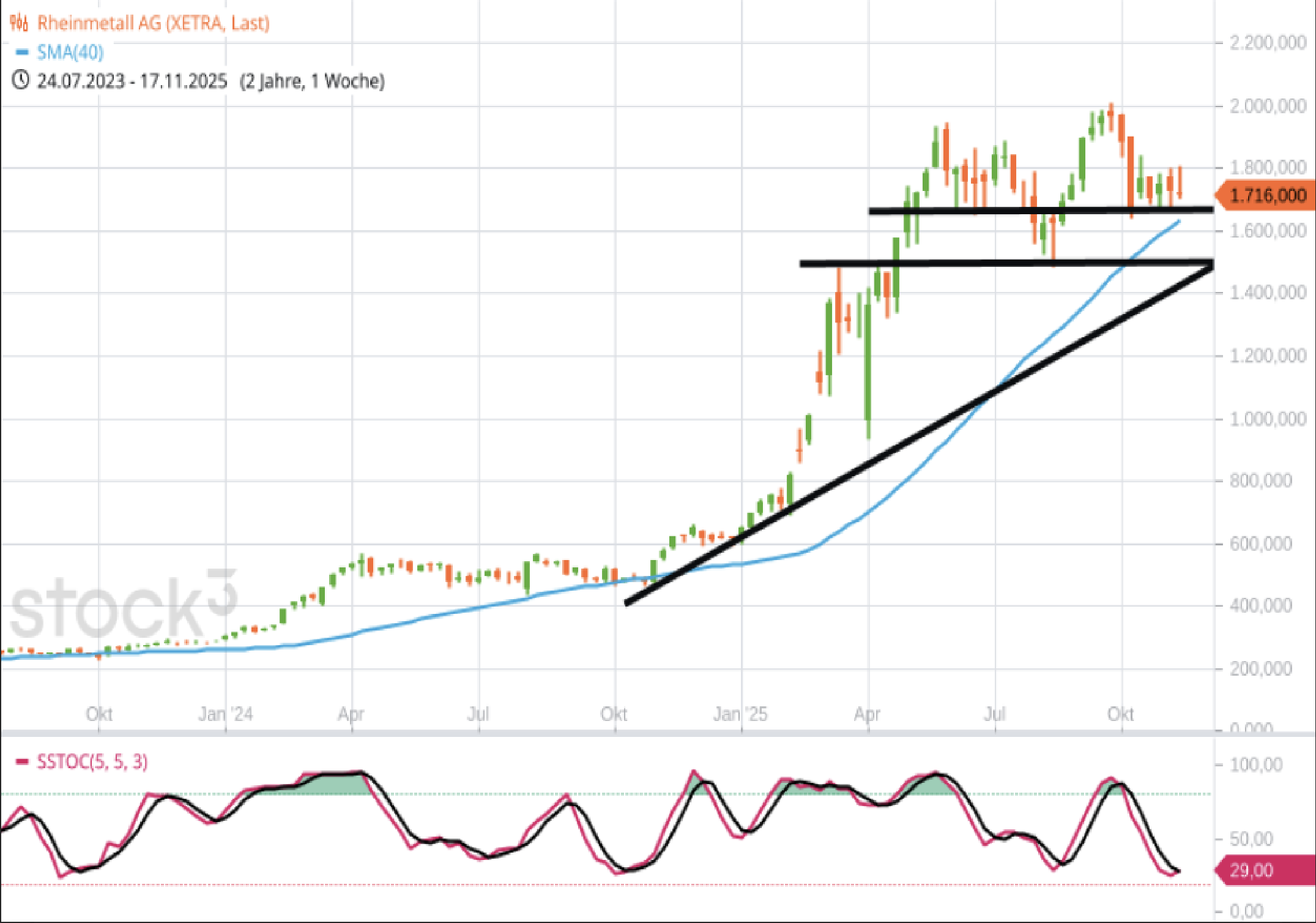 Im Ergebnis des CMDs sollten in den nächsten Tagen mehrere positive Analystenkommentare folgen mit einer Anhebung von Umsatz- und Gewinntaxen Richtung 2030. Der Konzern peilt für 2030 rund 50 Mrd. € Umsatz an, was einer Verfünffachung gegenüber 2024 (9,8 Mrd. €) entspräche. Dazu kommt erstmals ein klares Profitziel von mehr als 20 % operativer Marge. Die Guidance basiert auf der neuen Segmentstruktur, berücksichtigt potenzielle Übernahmen, schließt aber US-Aufträge aus. Letzterer Aspekt bietet einen weiteren Hebel, der im Konsens bislang nicht berücksichtigt ist. Operativ ist die Story intakt. Was bedeutet das in der Hochrechnung bis 2030, wenn die Ziele aufgehen? Etwa 160 € Gewinn je Aktie. Das wäre KGV 10,75. Einen neuerlichen Test der 2.000-€-Marke wollen wir nicht ausschließen. Allerdings kann innerhalb von 5 Jahren auch noch viel passieren. Die Bäume wachsen nicht mehr in den Himmel.