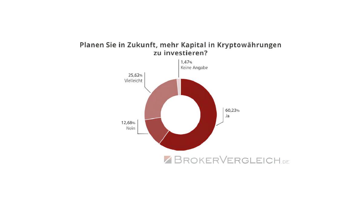 Nach Angaben des Portals gaben 60,2% der Befragten an, künftig mehr Geld in Kryptowährungen investieren zu wollen. Weitere 25,6% überlegen zumindest, ihre Investments auszuweiten.