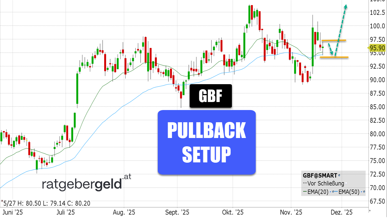 Rückblick: Die Meldung zum dritten Quartal 2025 wurde von Anlegern sehr positiv beurteilt, so dass die Bilfinger-Aktie die beiden gleitenden Durchschnitte in einem Rutsch überwand. Der anschließende Rücksetzer testete mit der Tageskerze vom heutigen Mittwoch erneut die beiden Linien, schloss aber darüber. Eine Fortsetzung des Aufwärtstrends ist weiterhin möglich. Mit einem Kursplus von rund 23 Prozent in sechs Monaten rangiert der Mannheimer Industriedienstleister unter den Top 3 der MDAX-Werte.