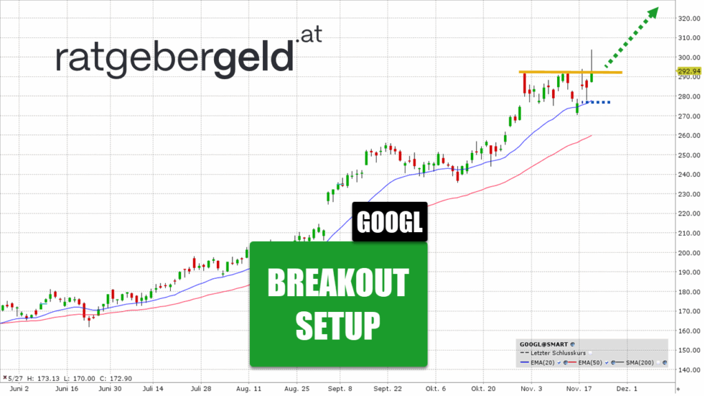 Die Alphabet-Aktie zieht über dem wichtigen gleitenden Durchschnitt EMA 20 stetig weiter nach oben. Zuletzt sahen wir eine Konsolidierung, aus welcher die Bullen heute einen Ausbruchsversuch starteten.
