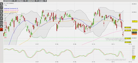 Der DAX hat seit der Etablierung des Allzeithochs am 09. Oktober Schwächetendenzen gezeigt. Hierbei gab es jüngst noch eine Zwischenerholung, welche am 12. November ein niedrigeres Verlaufshoch bei 24.445 Punkten erzeugt hat. Ausgehend von diesem lokalen Maximum wurde eine neue Verkaufswelle eingeleitet, welche den Index bis zum 18. November auf ein Mehrmonatstief bei 23.080 Punkte geführt hat. Da jene Tageskerze komplett unterhalb des Bollinger-bandes im überverkauften Bereich geformt wurde, konnte am 19. November eine temporäre Zwischenerholung zum Abbau der überverkauften Marktlage forciert werden. Die Bollinger-Bänder weiten sich aus. Außerdem belasten derzeit Verkaufssignale des GD 20, GD 50, GD 200 und eines in der Slow Stochastik.
