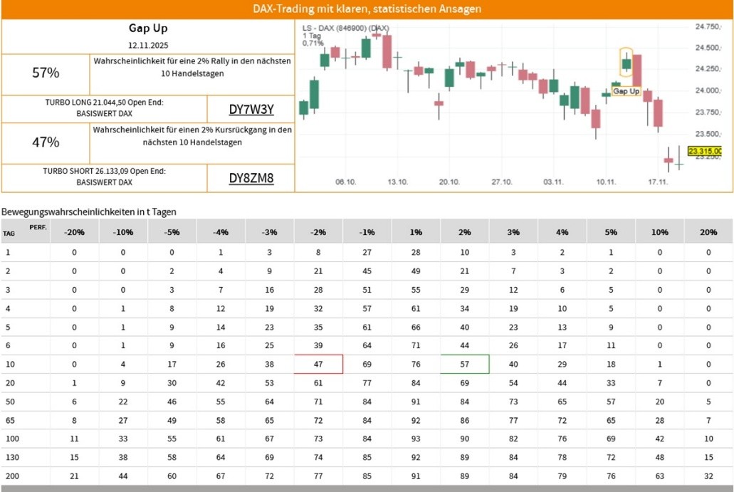Die Erfolgswahrscheinlichkeiten für das Signal "Gap Up" beruhen auf einer historischen Auswertung des Signals auf den LS-DAX im Zeitraum vom 02.01.2000 bis zum 19.11.2025. Dabei wurden die folgenden Voreinstellungen und Filter vorgenommen: