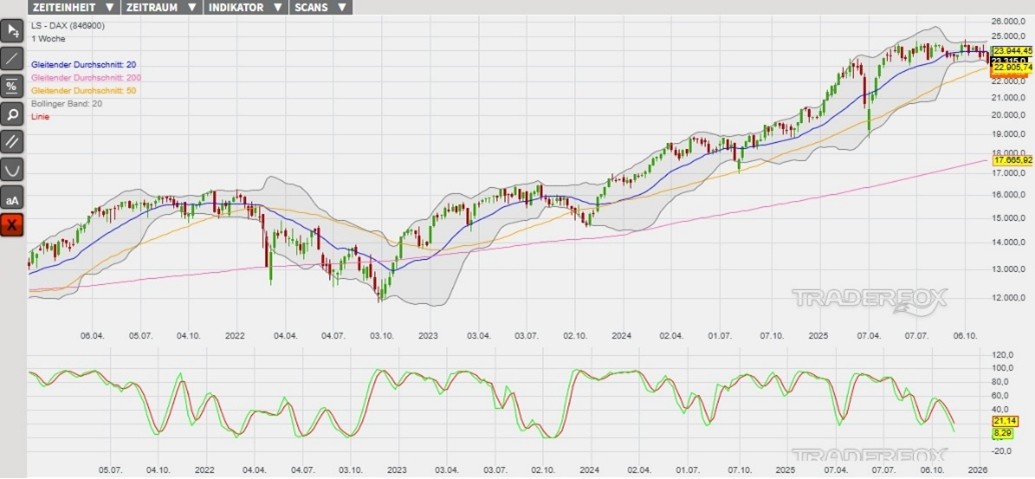 Wenn der nachhaltige Wiedereintritt in die Bollinger-Bänder heute gelingen sollte, dann könnte das Szenario einer Erholungsbewegung zum Abbau der überverkauften Marktlage in den kommenden Tagen seine Wirkung entfalten. In diesem Szenario markiert das Tageshoch vom 19. November bei 23.378 Punkten (Widerstand 1) die erste Barriere. Der Kursanstieg über dieses Hindernis könnte Anschlusskäufe bis zum GD 200 und daraufhin bis zum Tagestief vom 17. November bei 23.526 Punkten (Widerstand 2) auslösen. Durch die Berührung der zweiten Barriere würde wiederum eine noch offene Kurslücke wieder geschlossen werden. Als eine Anlagemöglichkeit in den DAX stehen verschiedene derivative Produkte zur Verfügung. Ein Beispiel ist der ENDLOS TURBO LONG 21.044,50 OPEN END: BASISWERT DAX der DZ BANK (WKN: DY7W3Y)* mit einem Basispreis von 21.044,50 Punkten. Der Hebel liegt am 20.11.2025 um 07:00 Uhr bei rund 10,52. Das Long-Szenario ist hinfällig, wenn der DAX nachhaltig unter die Unterstützung bei 22.858 Punkten (Unterstützung 2) fällt. Bitte beachten Sie die Produktrisiken, welche unten im Dokument beschrieben sind.