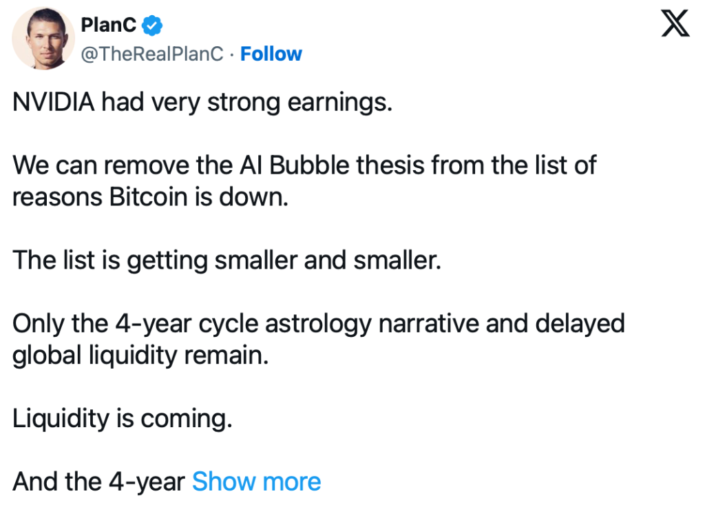 Damit entfällt ein entscheidender Risikofaktor: die Angst vor einer KI-Blase. Viele Anleger hatten befürchtet, ein schwaches Ergebnis könnte den KI-Sektor abrupt abkühlen lassen - mit potenziell starken Auswirkungen auf Risikoanlagen wie Bitcoin. Nvidia zeigte jedoch das Gegenteil: Die Nachfrage nach Hochleistungs-Hardware bleibt weiterhin stark, das KI-Narrativ stabil.