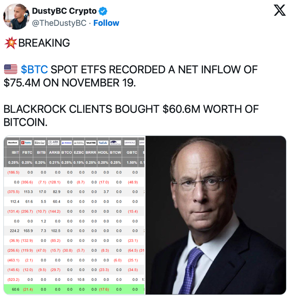 Nach einer Serie deutlicher Abflüsse wenden sich institutionelle Anleger wieder verstärkt dem Markt zu. Die Spot-Bitcoin-ETFs verzeichneten am 19. November einen Nettozufluss von 75,4 Millionen US-Dollar. Besonders stark: Über 60 Millionen davon entfielen auf Kunden von BlackRock.