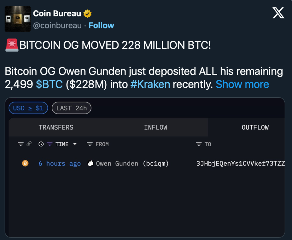 Für besonderes Aufsehen sorgte eine Bewegung des langjährigen Bitcoin-Investors Owen Gunden: Er transferierte sämtliche seiner 2.499 BTC im Wert von rund 228 Millionen US-Dollar zu Kraken. Solche Transfers von "Old Coins", die jahrelang unangetastet blieben, gelten oft als Signalphase - entweder zur Liquidation oder zur strategischen Umschichtung.